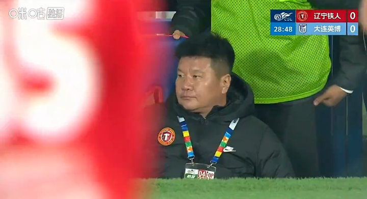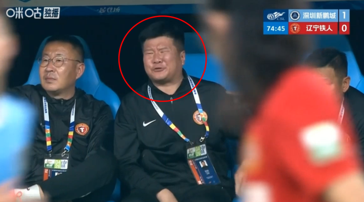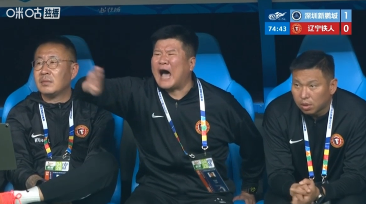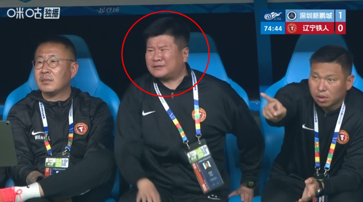 第74分钟时,也不知道场上的球员发生了什么事,直播镜头一转,聚集到了辽宁铁人队的替补席上。只见李金羽正挥手指挥着场上的球员,似乎在要求球队压上。李金羽边挥手,还涨红了脸大声喊着什么,说完别过头来一顿埋怨着啥(下图)。好玩,看出来李金羽是真的急了,愁得不得了!